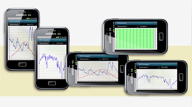 Android App WPS MO zum grafischen Überblick der übertragenen Daten. Ganglinien sind durch Antippen darstellbar, der Zustand farbig kenntlich gemacht.